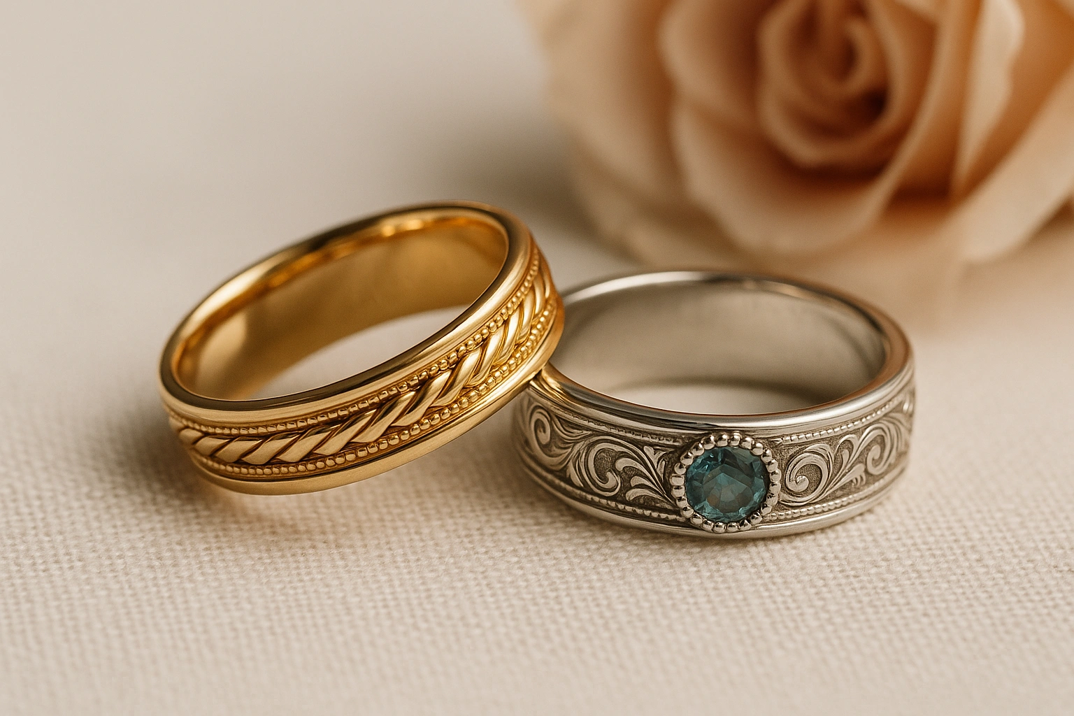 - Saskaņoti dizaini, bet atšķirīgi materiāli: Pāri izvēlas izmantot atšķirīgus materiālus, piemēram, viens partneris izvēlas zeltu, bet otrs – platīnu, saglabājot līdzīgas formas vai elementus, lai radītu līdzsvaru un vienotību.